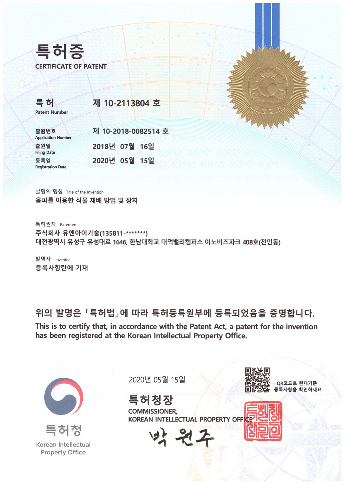 특허증 제 10-2113804호